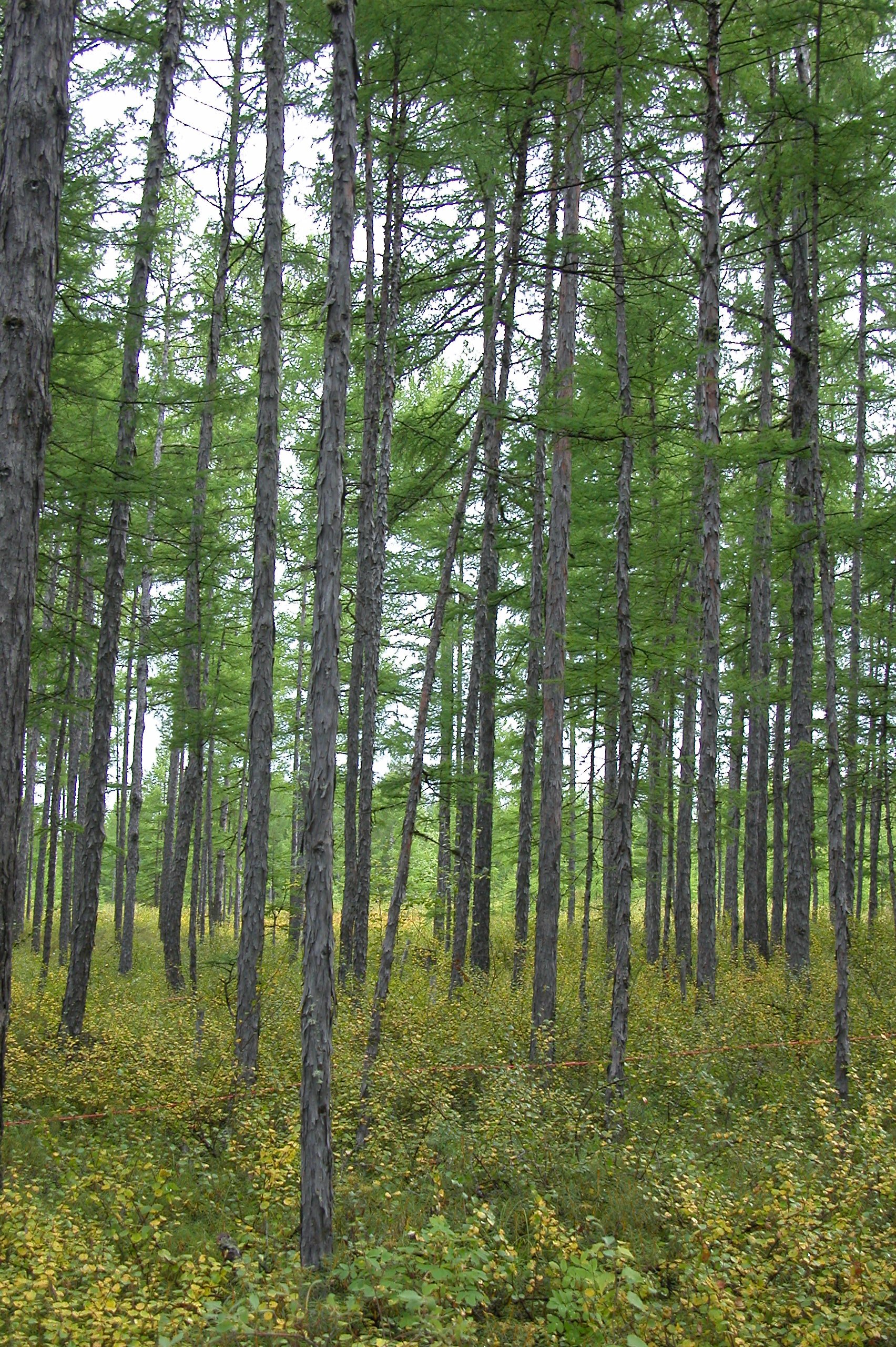 The original vegetation type is boreal forest, dominated by Larix gmelinii. Other tree species include Betula platyphylla Suk. and Pinus sylvestris var. mongolica. The average forest height is about 15m. The main shrub species include Ledum palustre, Vaccinium vitis-idaea, Rhododendron dauricum etc. The main grass species include Deyeuxia angustifolia, Carex appendiculata etc。